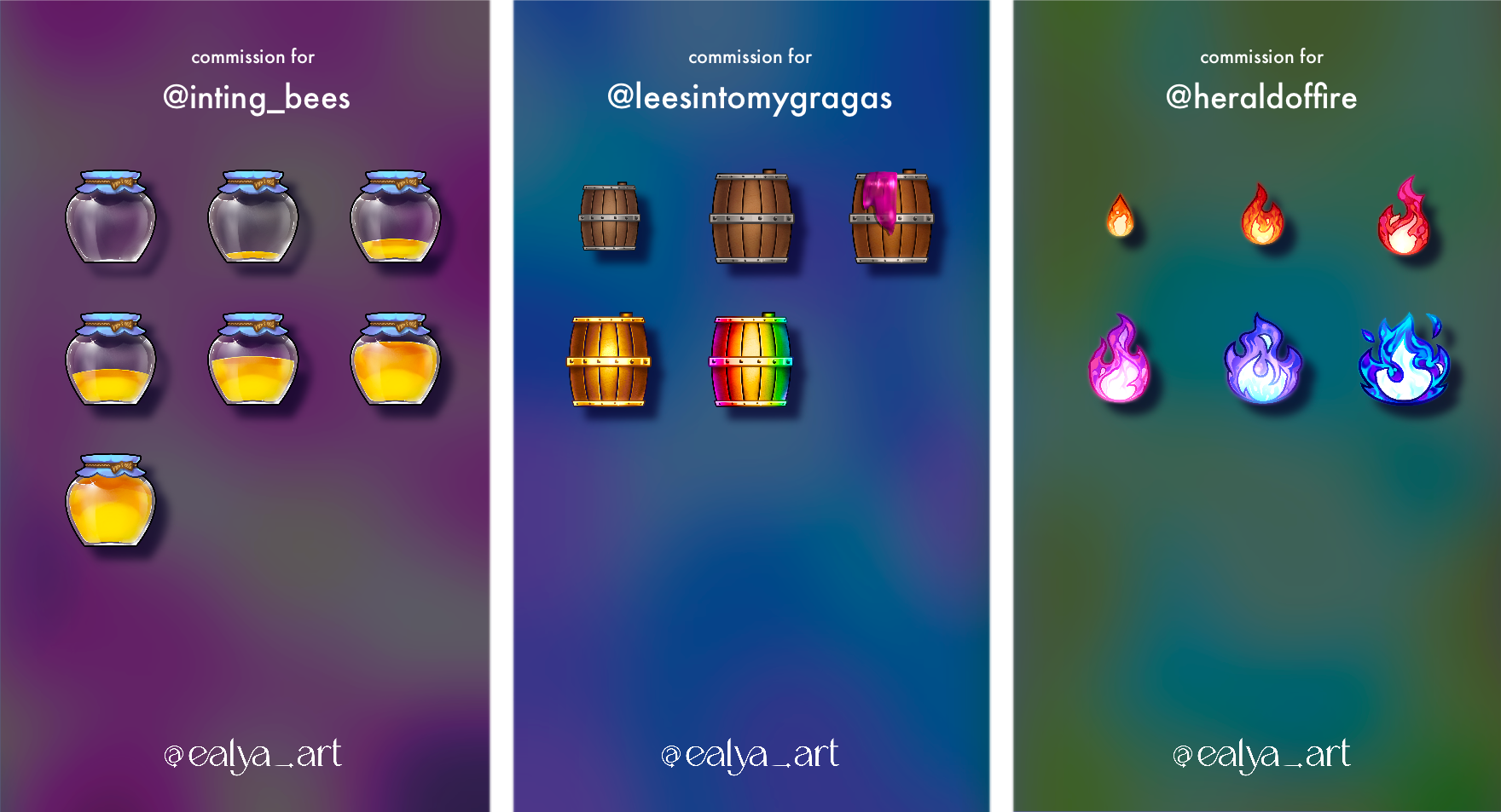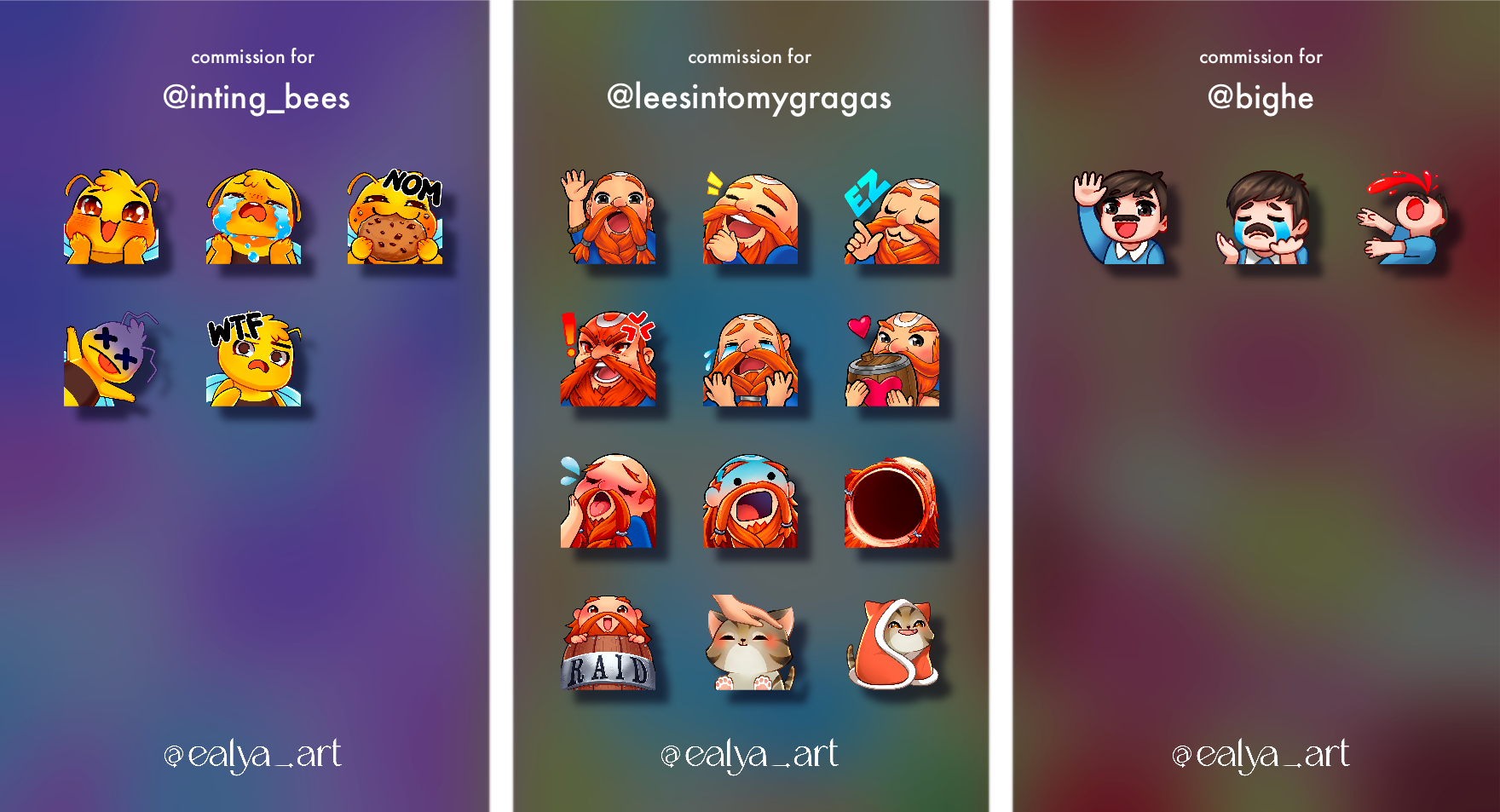 If you commissioned me any Twitch Graphics you must give me the "Artist Badge", and if you commissioned me emotes (static or animated) you must give me, @ealya_art on Twitch, the "Emote attribution".